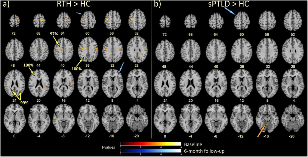 (a) People with Lyme disease who later returned to health (RTH) showed elevated brain activity soon after infection, relative to healthy controls (HC), shown highlighted in yellow. Many of these higher activations were located in white matter, with yellow arrows pointing to areas composed of more than 90% white matter. Blue arrows show the only two elevated activations 6 months later, indicating that most of the early extra activity had normalized over time.